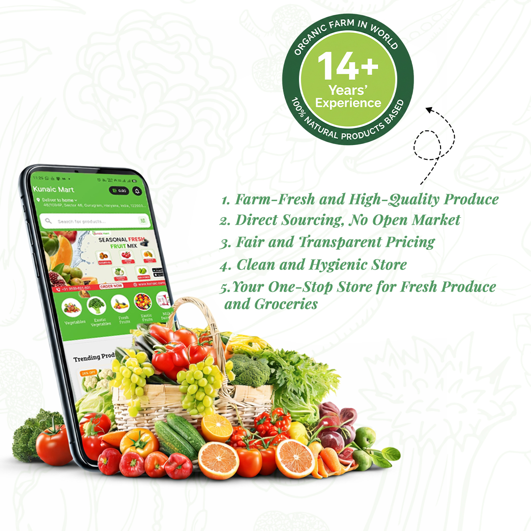 Over time, Kunaic evolved from a humble produce supplier into a full-fledged mandi-mart, offering not just fruits and vegetables but also daily essentials, trusted brands, and household staples — all under one reliable platform. By focusing on direct sourcing, hygiene-first handling, transparent pricing, and timely delivery, Kunaic has become more than just a grocery store. It has become a daily partner for families who value health, honesty, and peace of mind. Today, Kunaic proudly serves Gurgaon with a promise that remains unchanged from day one: real freshness, real value, and real trust — every single day.